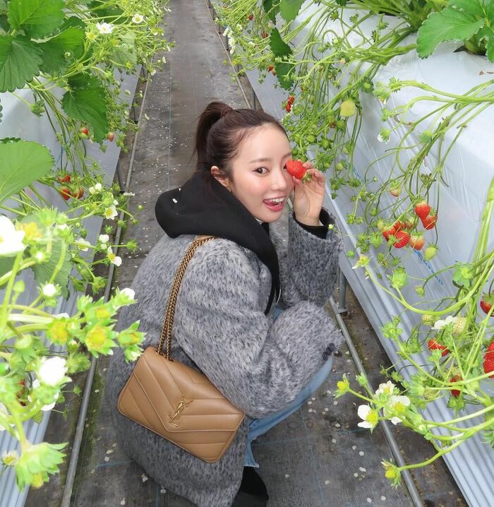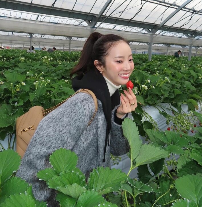 中町さんは「福岡でいちご狩りした」とコメントを添えて、複数枚の写真を投稿。グレーのコートにブルージーンズ、白いタートルネックという冬らしいコーディネートで、ビニールハウスのいちご畑で真っ赤に熟したいちごを手にしています。