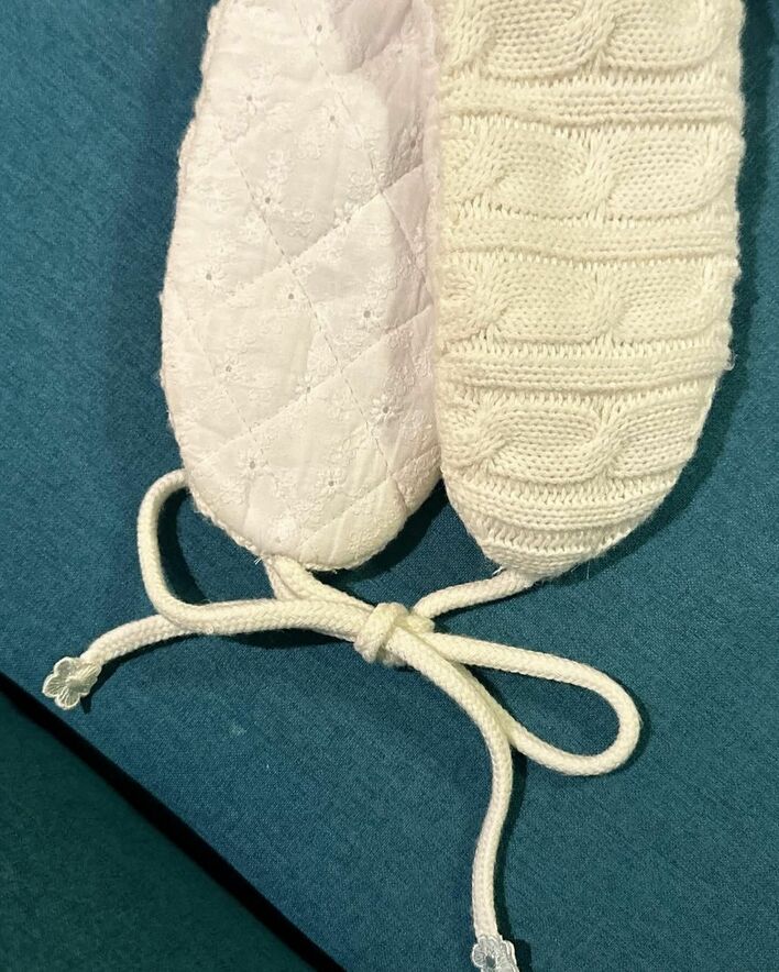 白色の毛糸で編まれた複雑な模様や、顎下で結んだ紐まで縫い合わせたかと思うと、かなりのクオリティーの高さです!