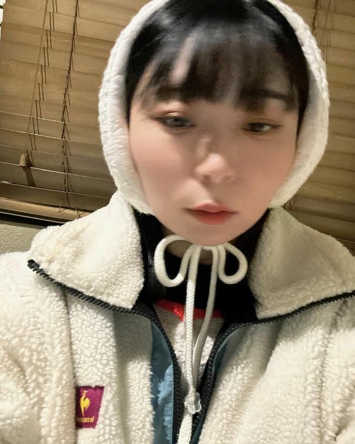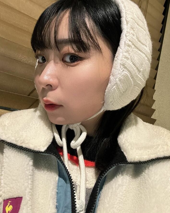自身で編んだ白色のイヤーマフラーを身につけ自撮りショットを公開しました。