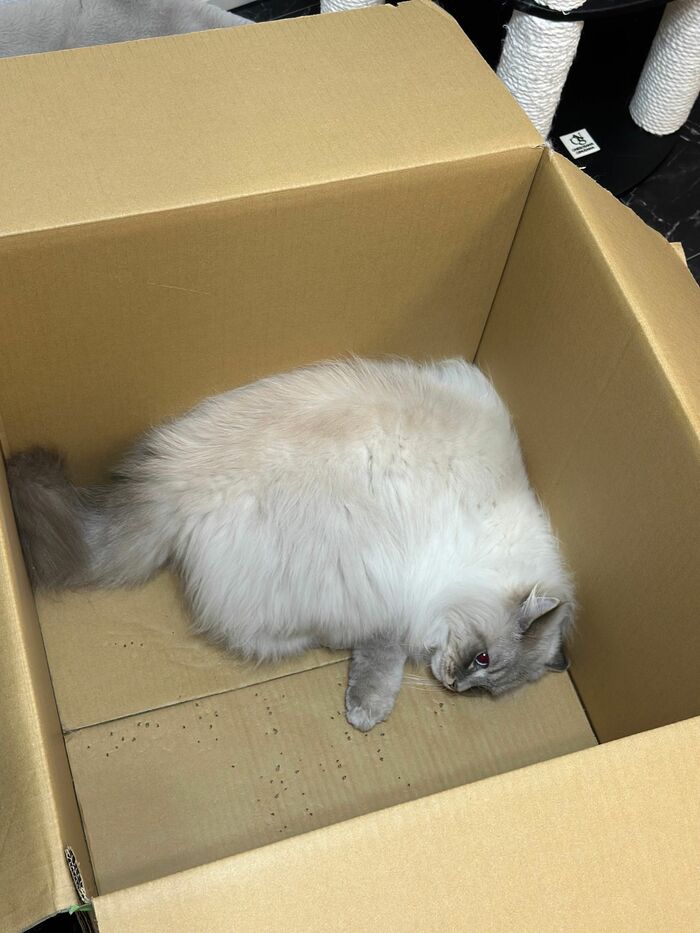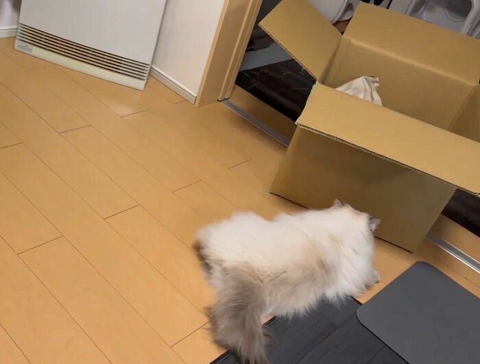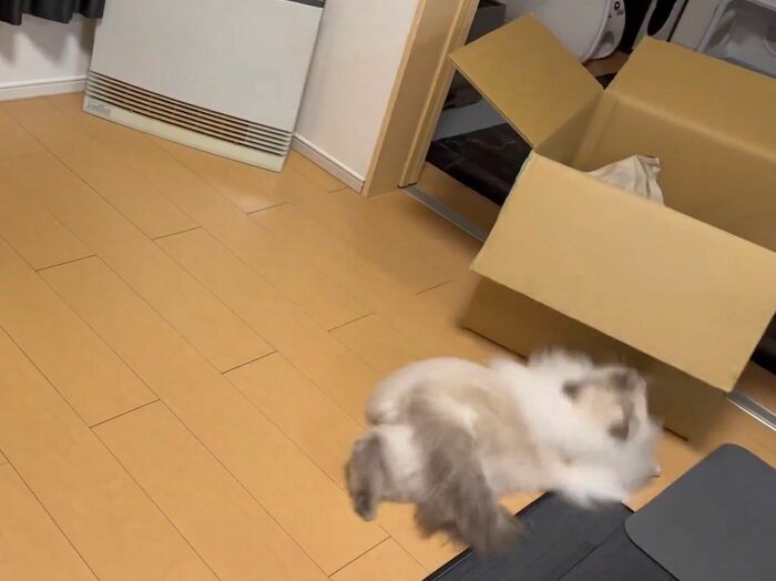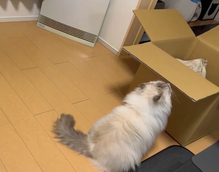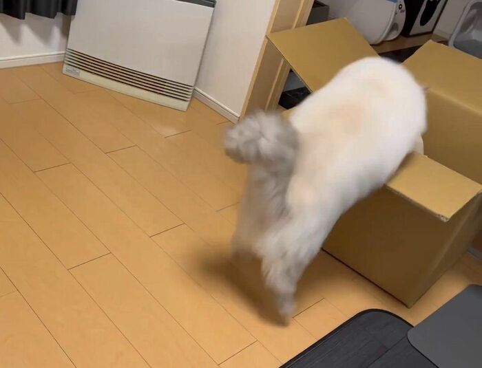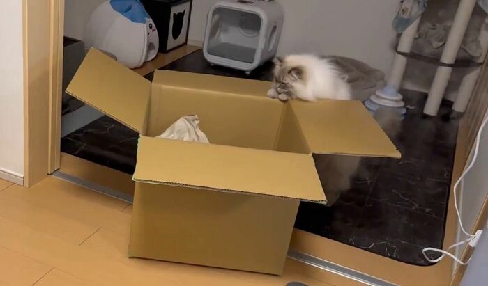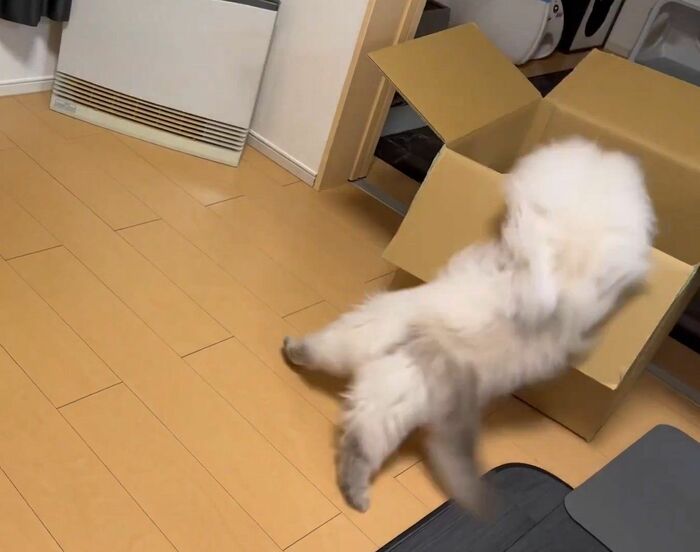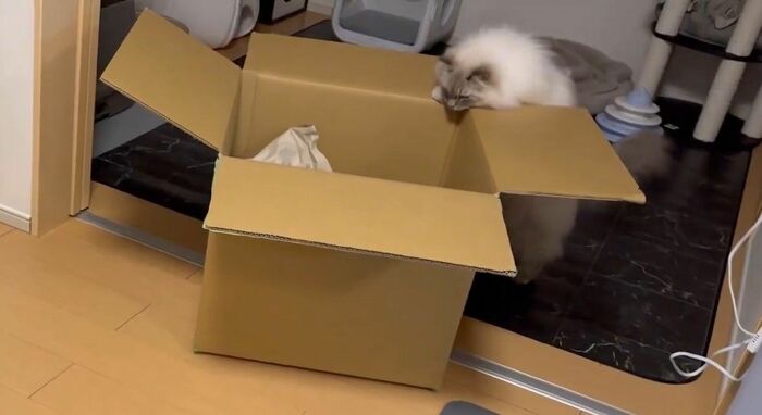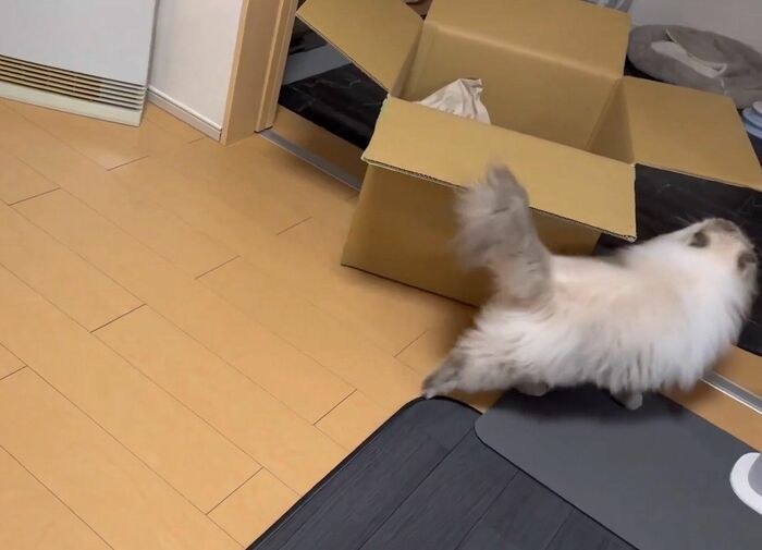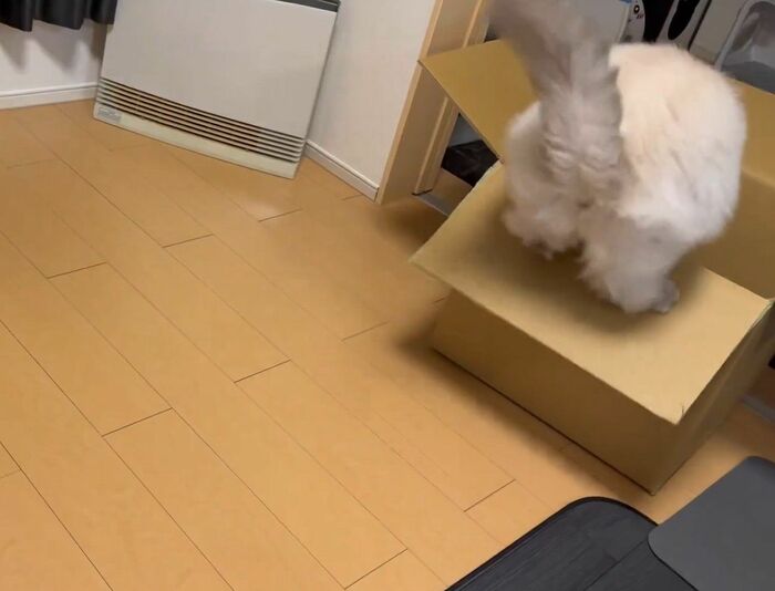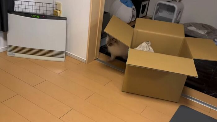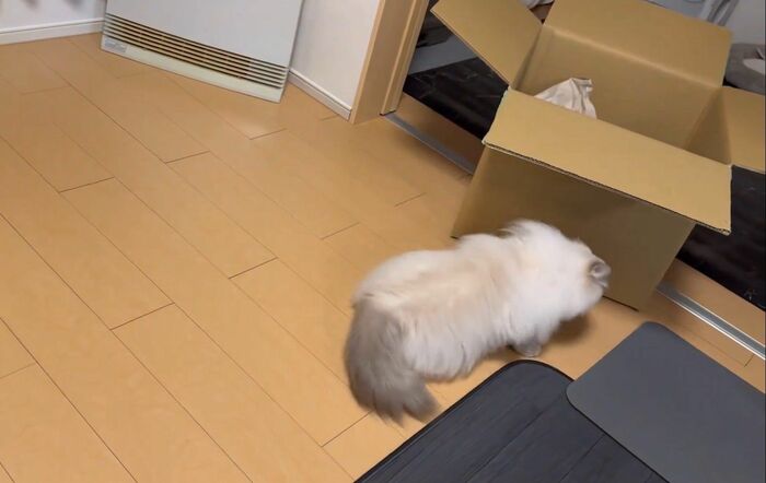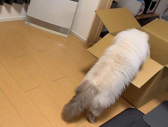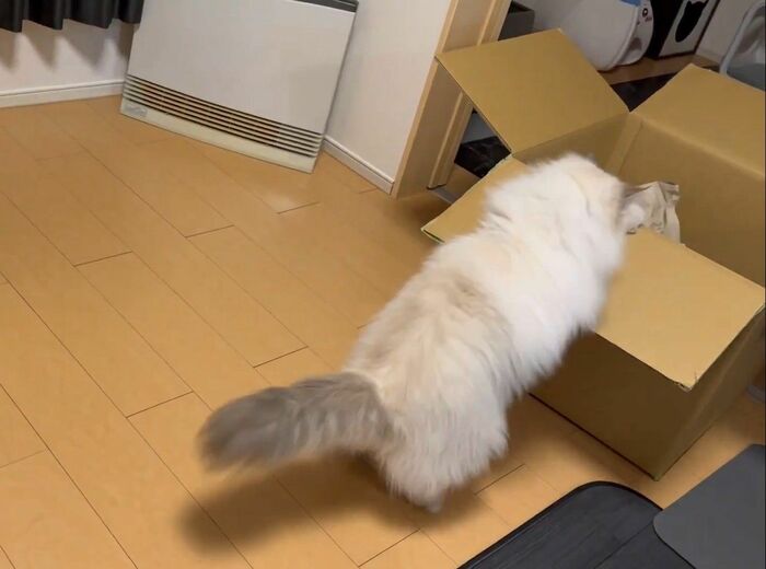 飼い主によると、いれぶんくんは普段から箱に入るのが好きで、空き箱があれば捨てる前に1度、遊ばせてから捨てているそう。