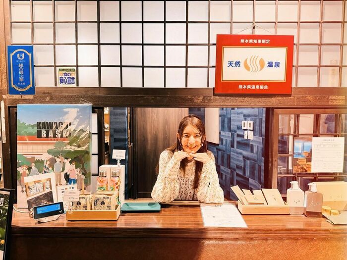 スザンヌさんは、アメニティーやボトルなど旅館ならではものが並べられた番台の窓から、笑顔で顔をのぞかせています。