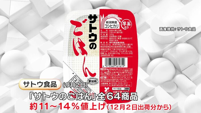 「サトウのごはん」を販売するサトウ食品は、2024年12月2日出荷分から「パックごはん」全64商品を約11%~14%値上げすると発表。