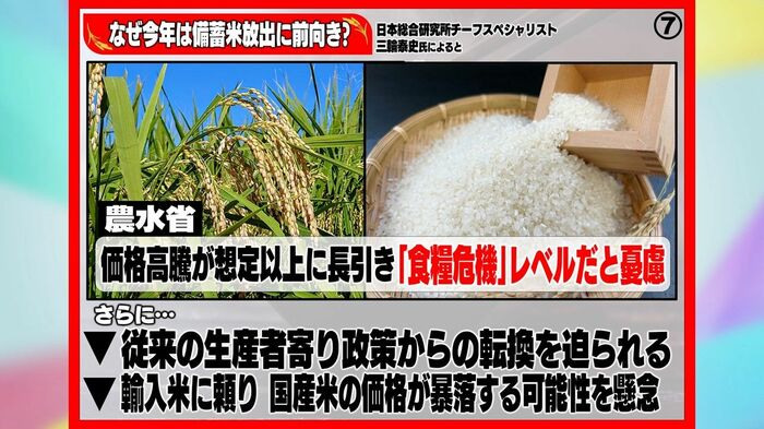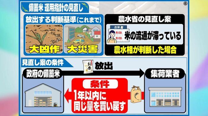 やはり、備蓄米の放出というのは米の流通からするとかなり強い影響をもたらすものなんですね。ですから、これまでは大凶作などで行っていたのですが、今回の価格の高騰、農水省が高いと考えているレベルをはるかに超えていて、もっと言うと我々消費者が気軽にお米を食べられないような状況になってくると。「食糧危機」ものがないのと同じくらいの状況だということで、今までの制度を拡大する形で不作・大災害と同じ形で緊急対応しようと。大きな政策の転換だと思います。