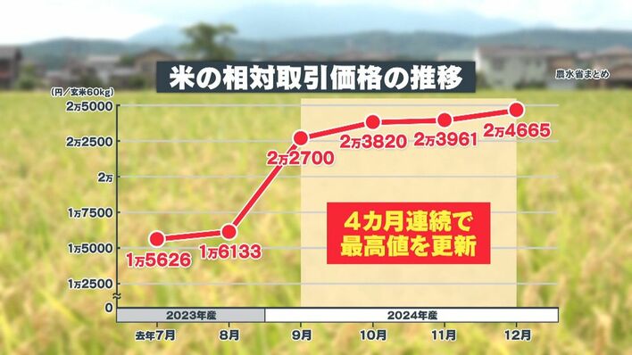 2024年12月の米の相対取引価格は、2万4665円となり4カ月連続で過去最高値を更新。