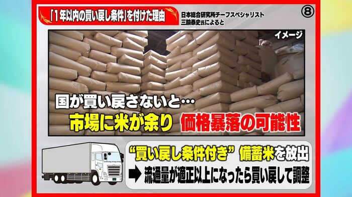 今、備蓄米を入れると市場の米が増える形になりますので、そのまま次の新米のシーズンになってしまうと、米の量が必要な量より増えてしまうと大暴落してしまう。