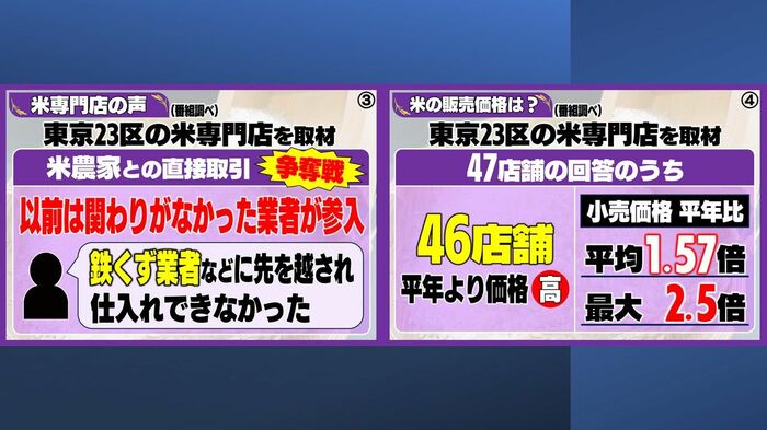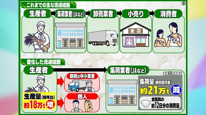 通常のルートであれば、それぞれの商慣行の中では信頼関係があるので、相場に合わせて売っていくんですが、そうじゃないところで異常な高値で買っていくと、JAであったり、卸業者はそこに負けないように高い値段で仕入れなくてはいけないということで、全体が“消えたお米”の影響で、値上がりにつながってしまっているという状況なんですね。