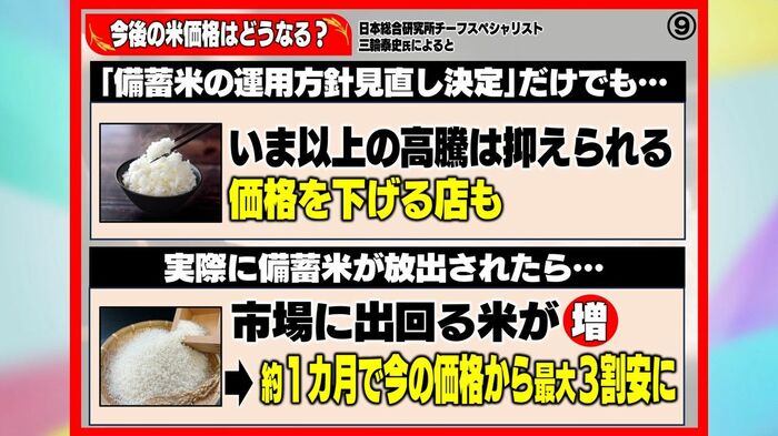 また、もし備蓄米が実際に放出されたら、市場に出回る米の量が急増するため、放出から1カ月で今の価格から最大3割ほど安くなる見通しです。