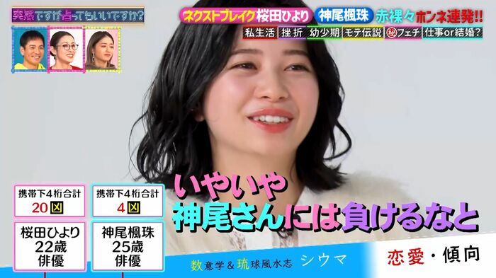 シウマさんが「桜田さんは17〜18歳がモテ期」と占うと、桜田さんは「17歳ですか…?」と笑顔のままフリーズ。その姿を神尾さんにツッコまれると、桜田さんはあわてて「いやいや、神尾さんには負けるなと思って」と反応しましたが…