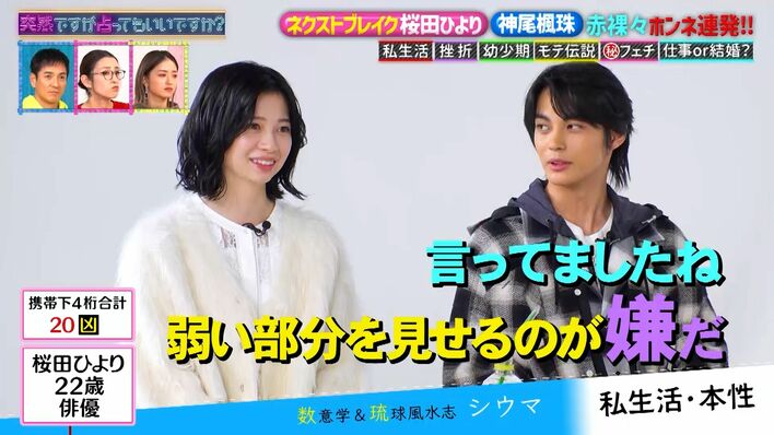 そしてシウマさんが、桜田さんの性格を「自分のことをあまり出したくない」と占うと、神尾さんが「『弱い部分を見せるのが嫌だ』ってずっと言ってました」と証言。