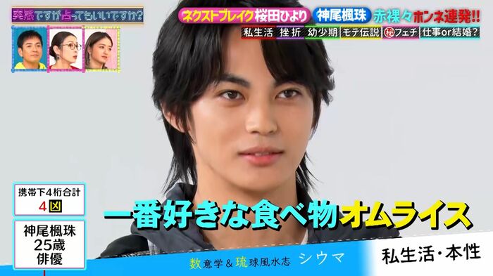 シウマさんは神尾さんについて「基本、お子ちゃま」とバッサリ。味覚においても辛いものがダメで、甘いものが大好きと占うと、神尾さんは「一番好きな食べ物はオムライス」と、はにかみました。