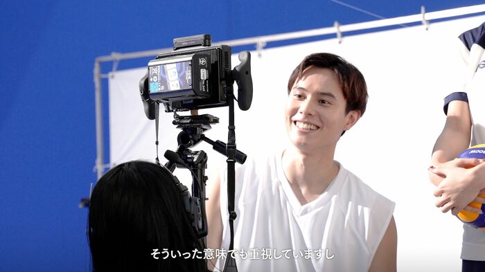 撮影では、髙橋選手がプロバレーボーラーと高速のスパイクやサービスを打ち合うなど、本気のプレーに撮影スタッフ一同が釘付けになる一幕も。髙橋藍選手の普段の様子が垣間見える、終始和やかな雰囲気の中で撮影が進みました。