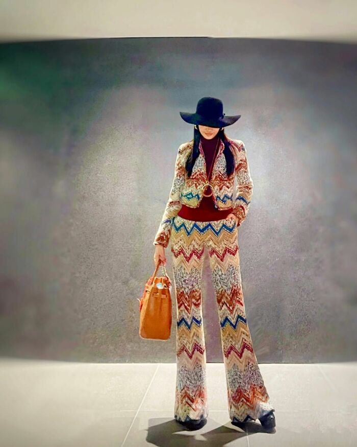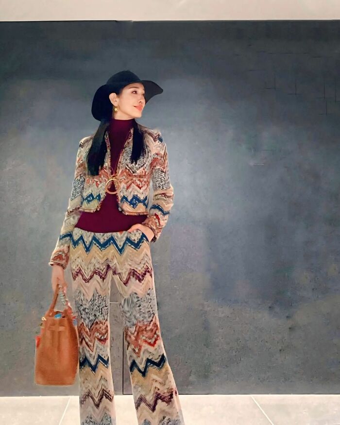 そこには、長年愛用している大好きなアイテムだという鮮やかなジグザグ模様が特徴的なセットアップを着用したアン ミカさんが、黒い広つばの帽子をかぶり、ハンドバッグを持つ姿が。全身のバランスが取れた、スタイリッシュな着こなしが印象的ですね。