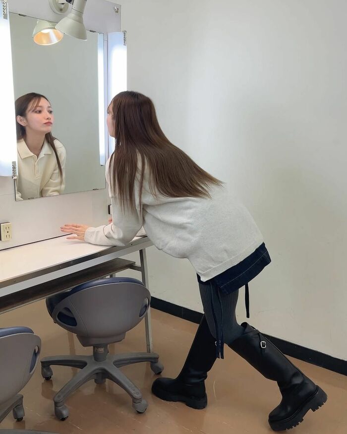 鏡の前のテーブルに手をつき、片足を一歩前に出し、前屈みになって鏡を見ている後ろ姿も披露。