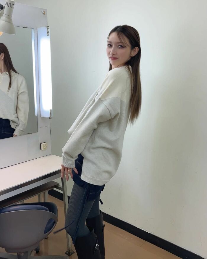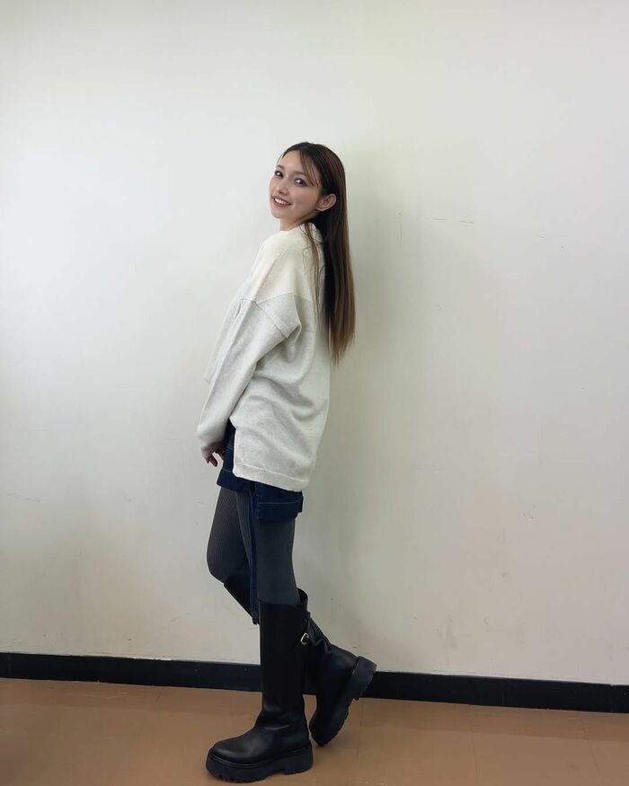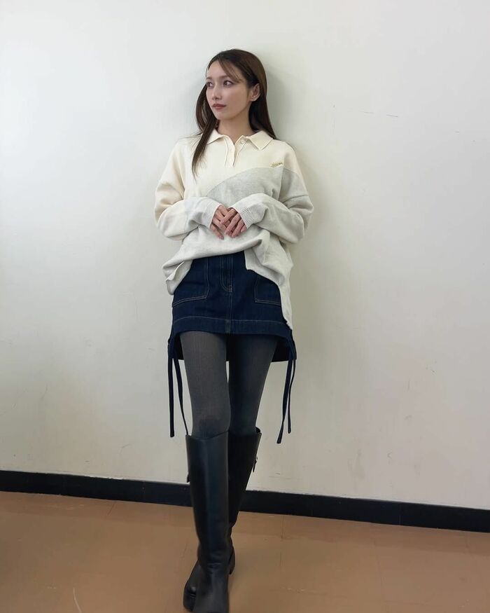 白と淡いグレーを基調としたゆったりとしたトップスに、左右両端にぶら下がった4本紐が目をひくデザインのミニ丈デニムスカートをはき、グレーのストッキングと黒いロングブーツを合わせたカジュアルな装いの後藤さん。