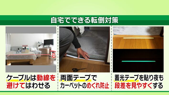 また成羽さんが「夜起きたときに、寝室のカーペットと敷居の段差で転びそうになった」と相談すると、田中さんは「カーペット用の両面テープを使ってカーペットが浮き上がらないようにする」「段差の手前に蓄光テープを貼る」といった対策を提案しました。