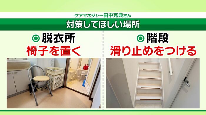 田中さんは、「着替えるときは片足立ちでバランスを崩しやすいので、脱衣所に椅子を置く」「階段に滑り止めテープを貼る」など、リフォームを検討する前にできる対策もアドバイス。