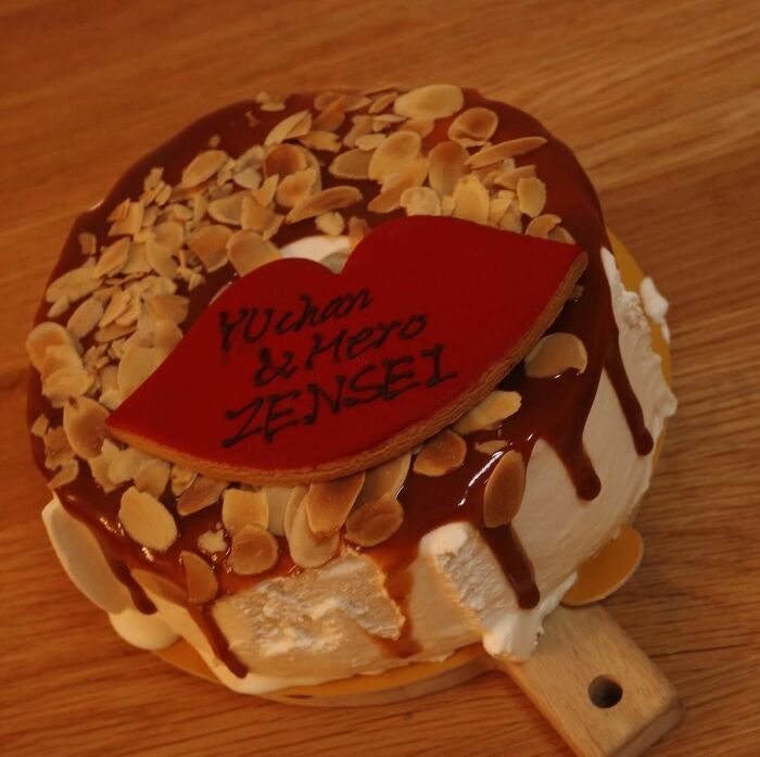 キャラメルのようなソースがたっぷりとかかったケーキの上に乗っている唇型の飾りを・・・