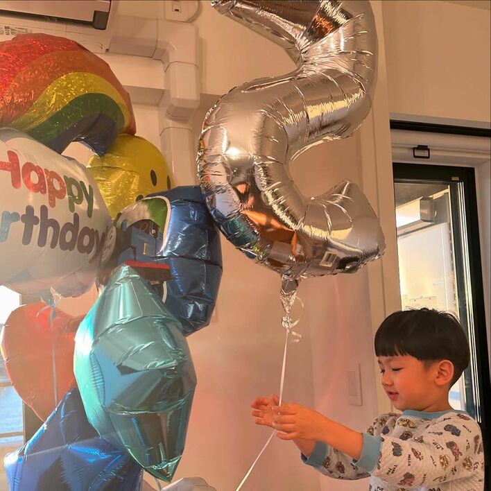 公開された写真には、数字の「5」やスマイルや星をかたどったカラフルな風船に夢中になる禅清くんや・・・。