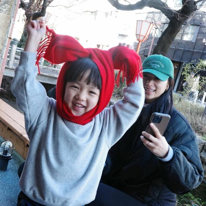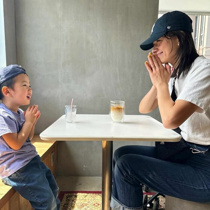 カフェタイムでしょうか、高橋さんと禅清くんが向かい合って手を合わせる姿など、ほほ笑ましい親子ショットも公開。