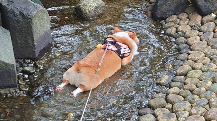 水に入るのが大好きな「紬」ちゃんに、見た人からは「かわいい食パンが浮かんでる…」「びろ~んってなっててかわいい」「冷やしコーギーはじめました」と多くの反響が寄せられています。