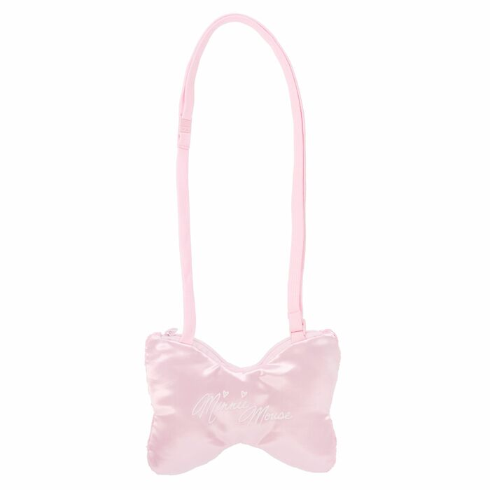 パステルカラーのミニー型ショルダーバッグは、パークだけでなく普段使いにもぴったり♪「Minnie Mouse」の文字とハートのデザインが、乙女心をくすぐります。