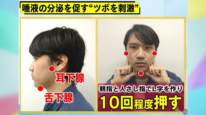 顎の下に舌下腺(ぜっかせん)と耳たぶの横にある耳下腺(じかせん)と呼ばれる部分が、唾液の分泌を促す“ツボ”といわれています。