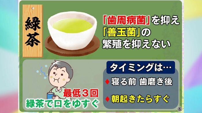 緑茶は「歯周病菌」を抑え、「善玉菌」の繁殖を抑えないという性質を持っているため、緑茶を口に含んで最低3回ほどゆすぐといいといいます。