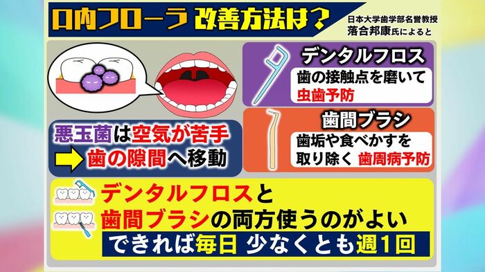 落合氏によると、悪玉菌は、空気が苦手なのでどんどん歯の隙間へ移動するため、歯ブラシだけではなく、「デンタルフロス(糸)」と「歯間ブラシ」などを使って歯の隙間をきれいにすると効果があるといいます。