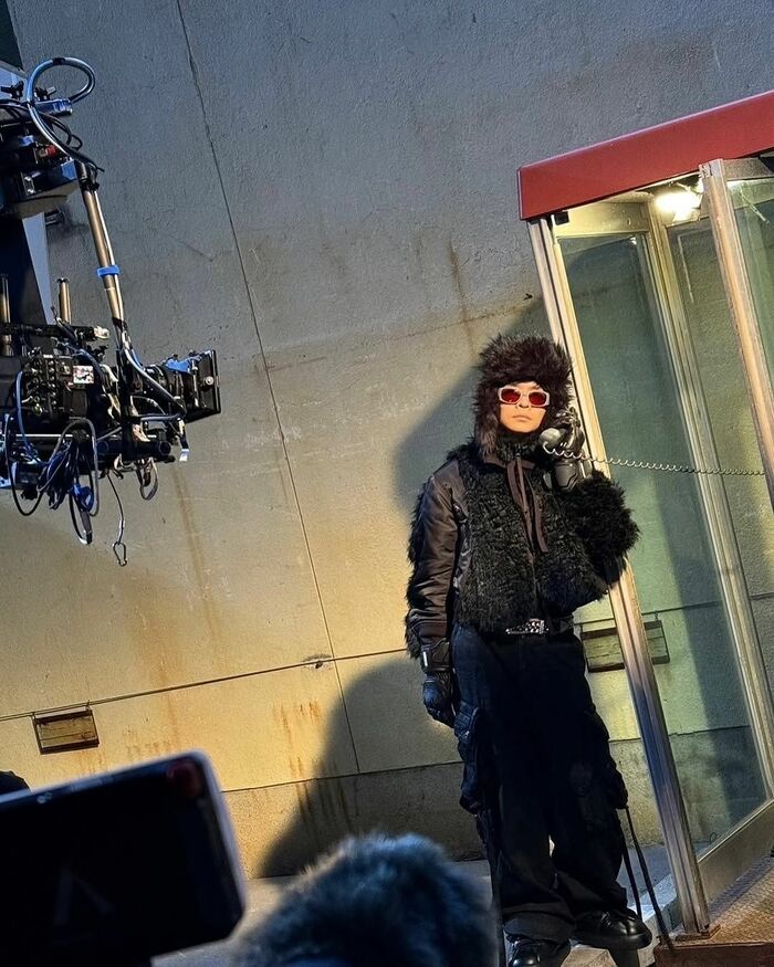 岸さんは、ボリュームたっぷりのファーがついたジャケット姿でフードをすっぽり被り、サングラスをかけ、受話器を片手に電話ボックスに寄りかかっている様子や…