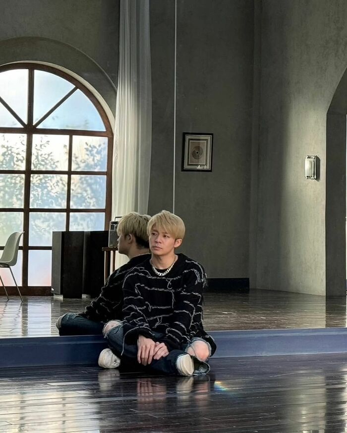 ニットにダメージジーンズ姿で、スタジオの床にあぐらをかいて座り、遠くを見つめているショットを公開。