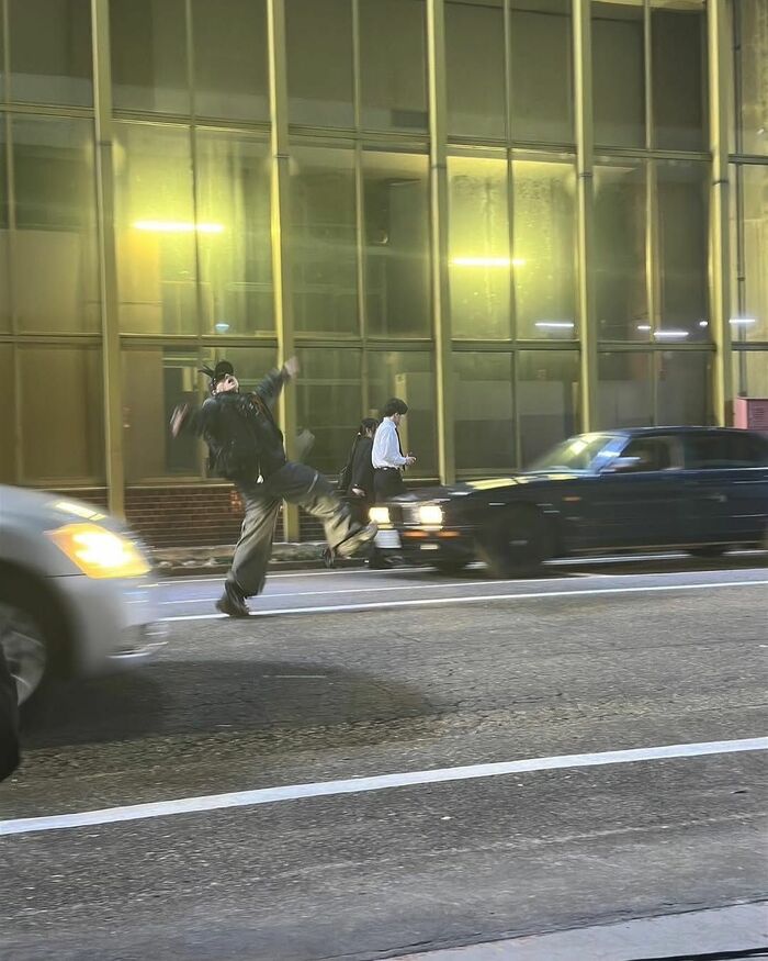 車が行き交う道路の真ん中で、踊っているような躍動感あふれるショットも披露。