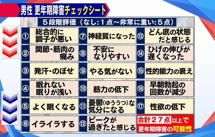また、厚労省や自治体などでは、自分が更年期障害かどうか判断するためのチェックシート、AMSスコア(男性更年期障害質問票)も公開しており、さらに詳しく“可能性のある症状”を知ることができます。