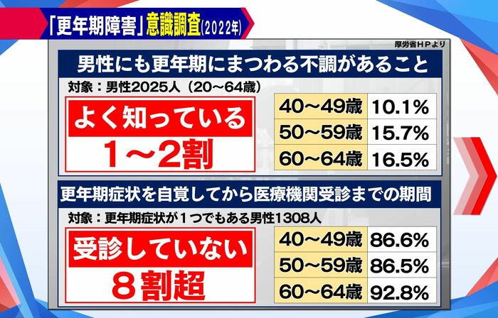 2022年に厚生労働省が行った「更年期症状・障害に関する意識調査」(全国20~64歳の男女計5000人)では、「男性にも更年期にまつわる不調があることを知っているか?」という問いに対して、女性の40代以降は約30~50%近くが「よく知っている」と答えたのに対し、男性は最も高い60~64歳でも16.5%にとどまりました。