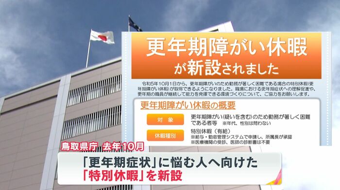 この結果を受け鳥取県では2023年10月に、「更年期症状」に悩む人へ向けた特別休暇を新設。これまでに女性20人、男性10人が取得しました。