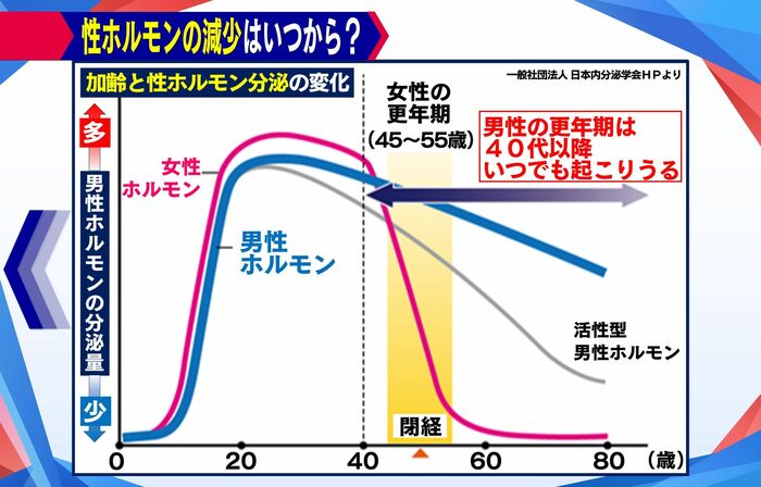 ホルモン量の減少は、女性は40歳を境に急激に減少しますが、男性も同じく40歳を過ぎた辺りから緩やかに減少していきます。男性でも40代以降はいつでも起こりうるという意識が大切です。