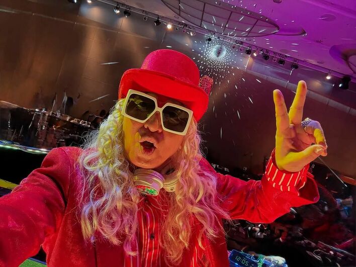 公開された写真を見てみると、赤のジャケットに青のキャップをかぶってピースをしているDJ KOOさんの隣にいるのは…現在、吉本新喜劇ゼネラルマネージャーを務める、芸人の間寛平さん!