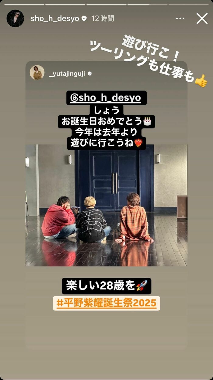 神宮寺勇太さんは、「しょう お誕生日おめでとう 今年は去年より遊びに行こうね 楽しい28歳を」とつづりストーリーズを更新。この投稿に平野さんは、「遊び行こ!ツーリングも仕事も」と反応し、仲の良いやりとりを繰り広げました。