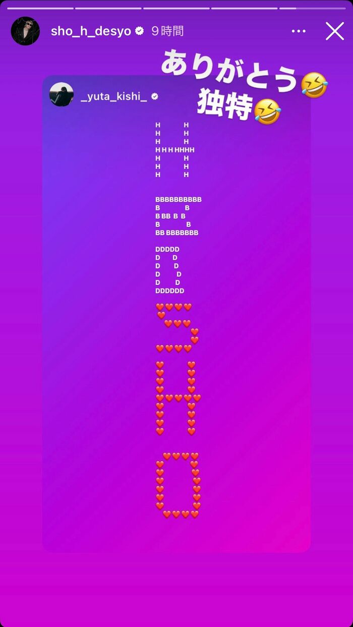 そして、独特すぎるおめでとうを送ったのは岸優太さん。紫の背景に「HBD SHO」と縦書きでつづりストーリーズを更新。この違和感のある文章をよーく見てみると…