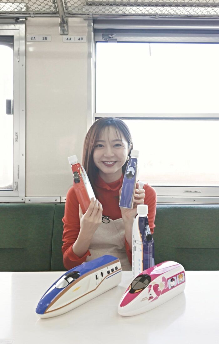 そろそろおなかがすいてきた佐久間アナ。ミニ運転パークの近くにある駅弁屋さんで、列車の形をしたお弁当とドリンクを買い込み、自由に食事をしていいというランチトレインで旅気分に浸りながら、試食しました。