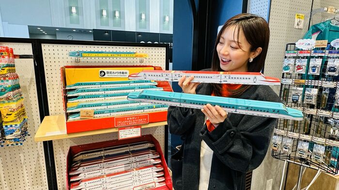 最後にミュージアムショップでおみやげ探し。実にいろいろな種類がありますが、長~い新幹線の形をした「ロングバウムクーヘン」が人気だそうです。長さ約50cmで、もらった人が誰かに見せたくなる一品です。