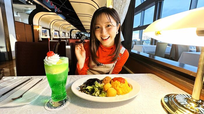 佐久間アナはハンバーグ、カニコロッケ、オムライスなど盛りだくさんで、まるで大人のお子さまランチのような特製ワンプレート(現在は販売していません)とクリームソーダをいただきました。「どれもおいしい!」とはじける笑顔。窓越しに外を走る電車も見えるので、鉄道旅している気分に浸れます。