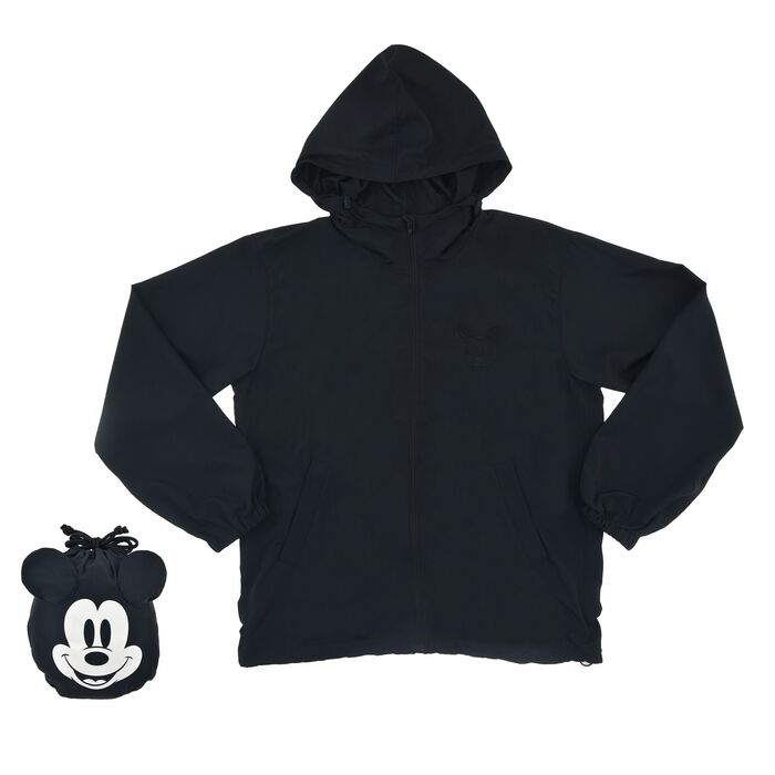 胸元のミッキーのワンポイント刺しゅうは生地と同色なので主張しすぎず、大人っぽく着こなせます。さらにミッキーの顔が大きくデザインされた付属の巾着に入れてコンパクトに持ち運びできるのがポイントです。