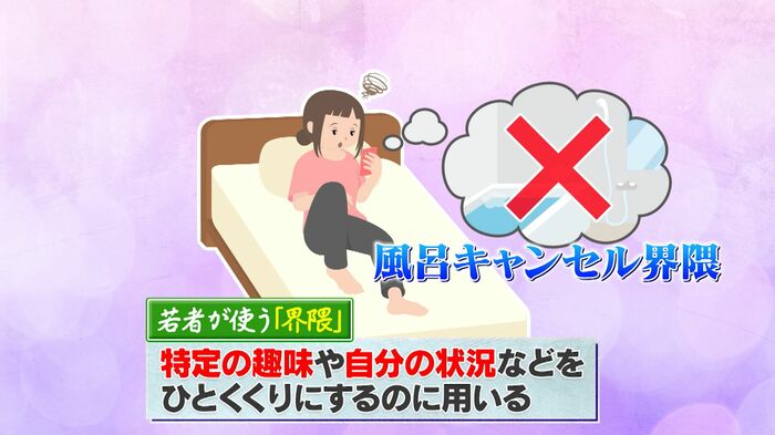 若者が使う界隈とは特定の趣味や自分の状況などをひとくくりにし、夜、お風呂に入らない人たちを「風呂キャンセル界隈」ということです。