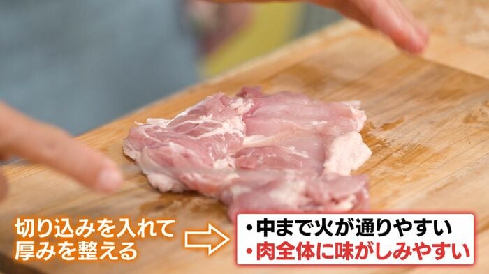 注目するのは肉の厚み。ここに切り込みを入れ厚みを均等にします。