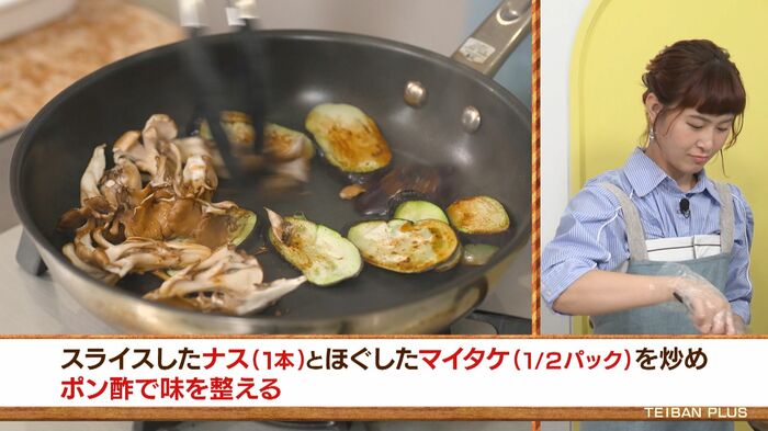 ⑤付け合わせにフライパンで薄切りにしたナスとマイタケを炒め、ポン酢で味を整える