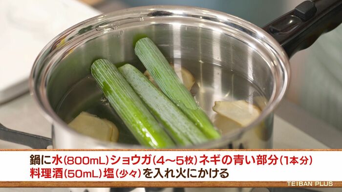 ①水を入れた鍋に、長ネギの青い部分、ショウガ、お酒、塩を入れひと煮立ちさせる