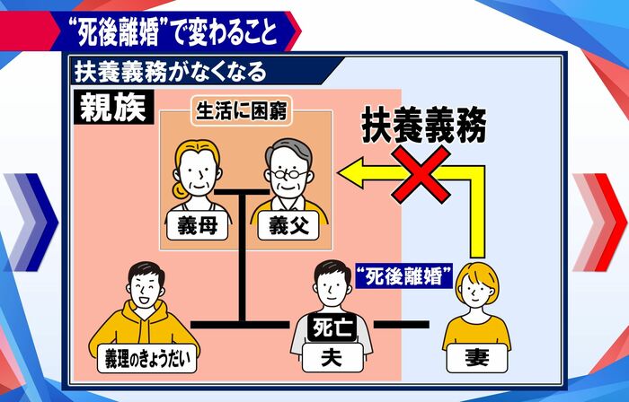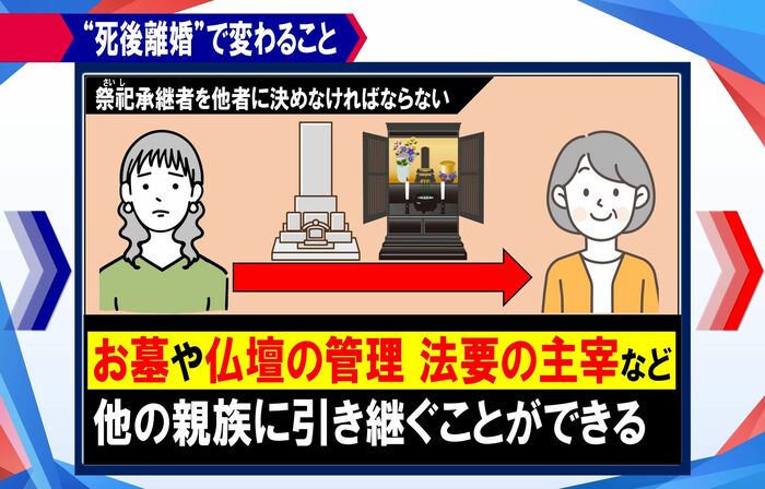 死後離婚を行うと、何が変わるのか。まず、親族ではなくなるため、「扶養義務」がなくなります。さらに、お墓や仏壇の管理、法要の主宰などを行う、祭祀承継者を他の親族に引き継ぐこともできます。