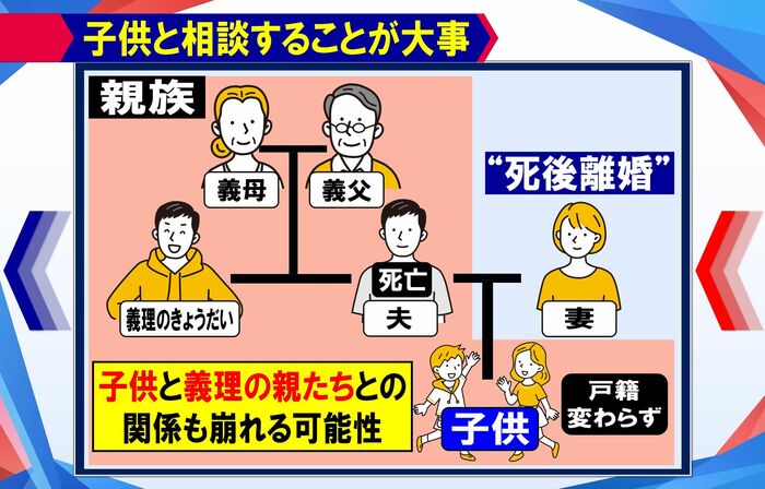ただし、義父母の遺産相続となると、長年義父母の介護などをしていた場合、義父母が亡くなったら相続人以外の親族でも遺産に対して金銭を請求できる「特別寄与料」という制度がありますが、死後離婚すると親族という立場ではなくなるため請求ができなくなる可能性があるそうです。