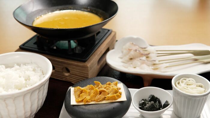 総料理長・藤見泰之さんが紹介してくれたのは、「うずの丘 海鮮うにしゃぶ」。まろやかなコクのうにスープに海鮮をくぐらせていただく、なんとも贅沢な一品です。