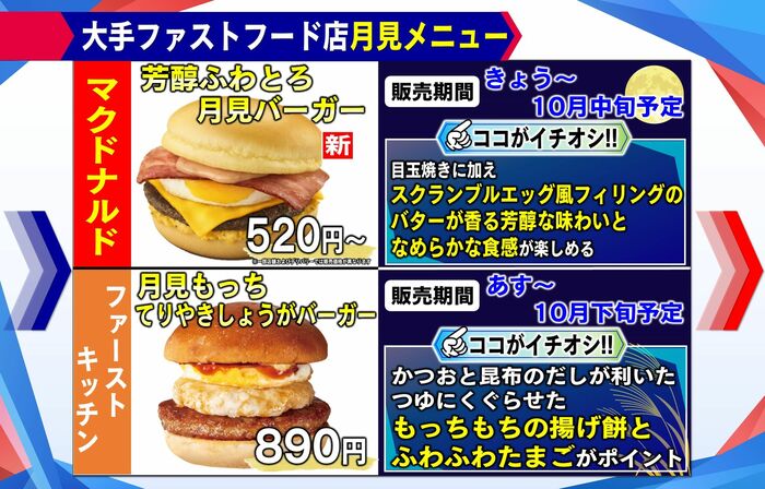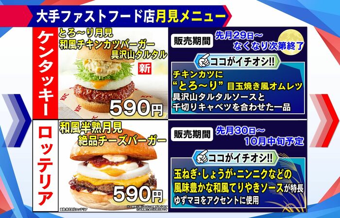 マクドナルド以外にも、さまざまな大手ファストフード店が、新作の“月見バーガー”を販売します。